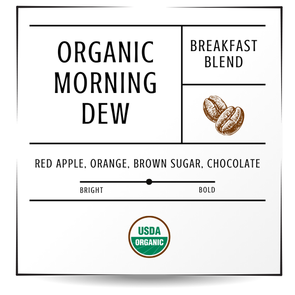 Our morning dew - breakfast blend is a blend of Central and South American coffees roasted just a bit lighter than the standard "full city" degree of roast. This cup has smooth chocolaty aromas with a balanced light-to-medium body and a subtle, light finish. This is one of our best selling coffees, brewing a great cup of coffee (and not just for breakfast time). It doubles as a very nice espresso blend as well!